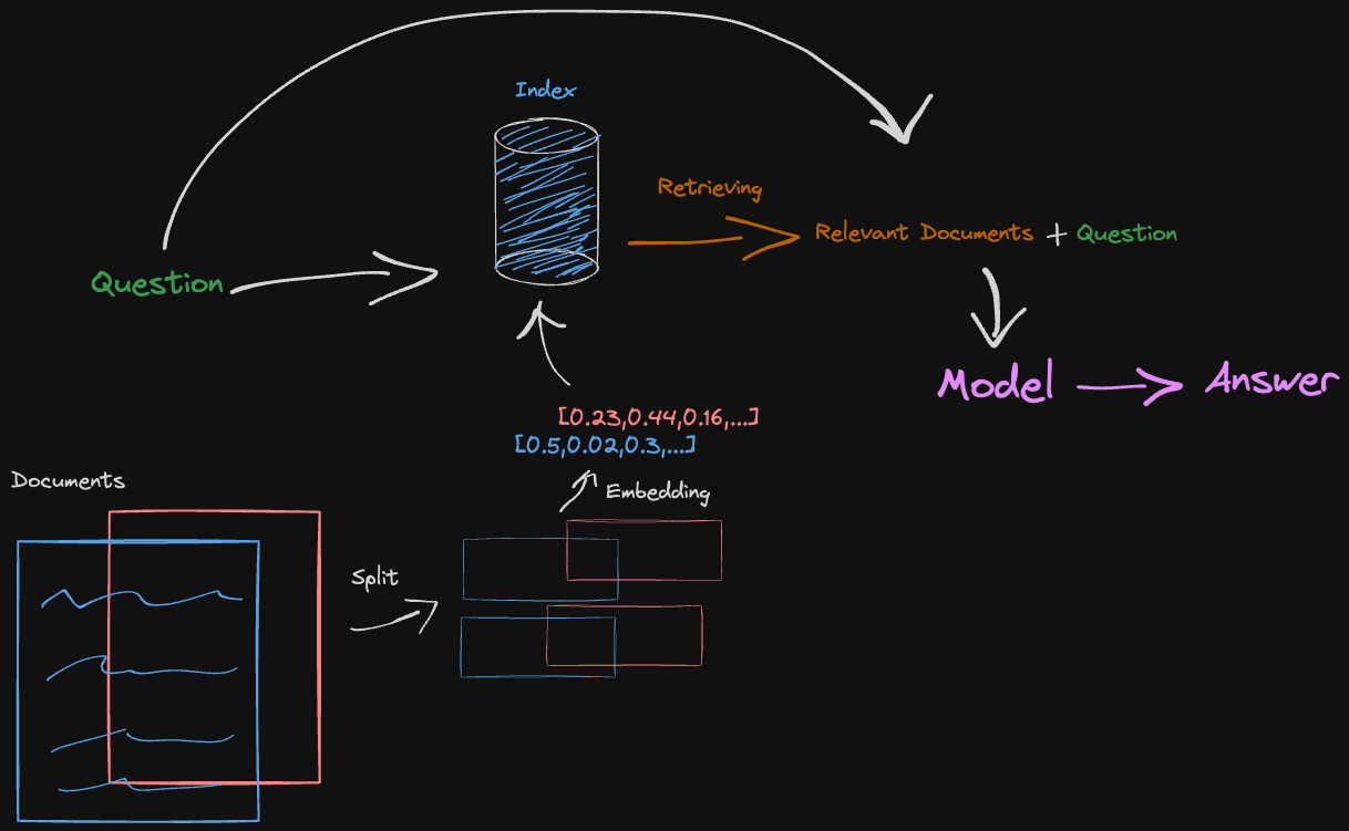 The documents are split to fit into an embedding model. Then retrieved based on similarity score with the question. The model finally gives an answer using both the question and the extra relevant document splits.